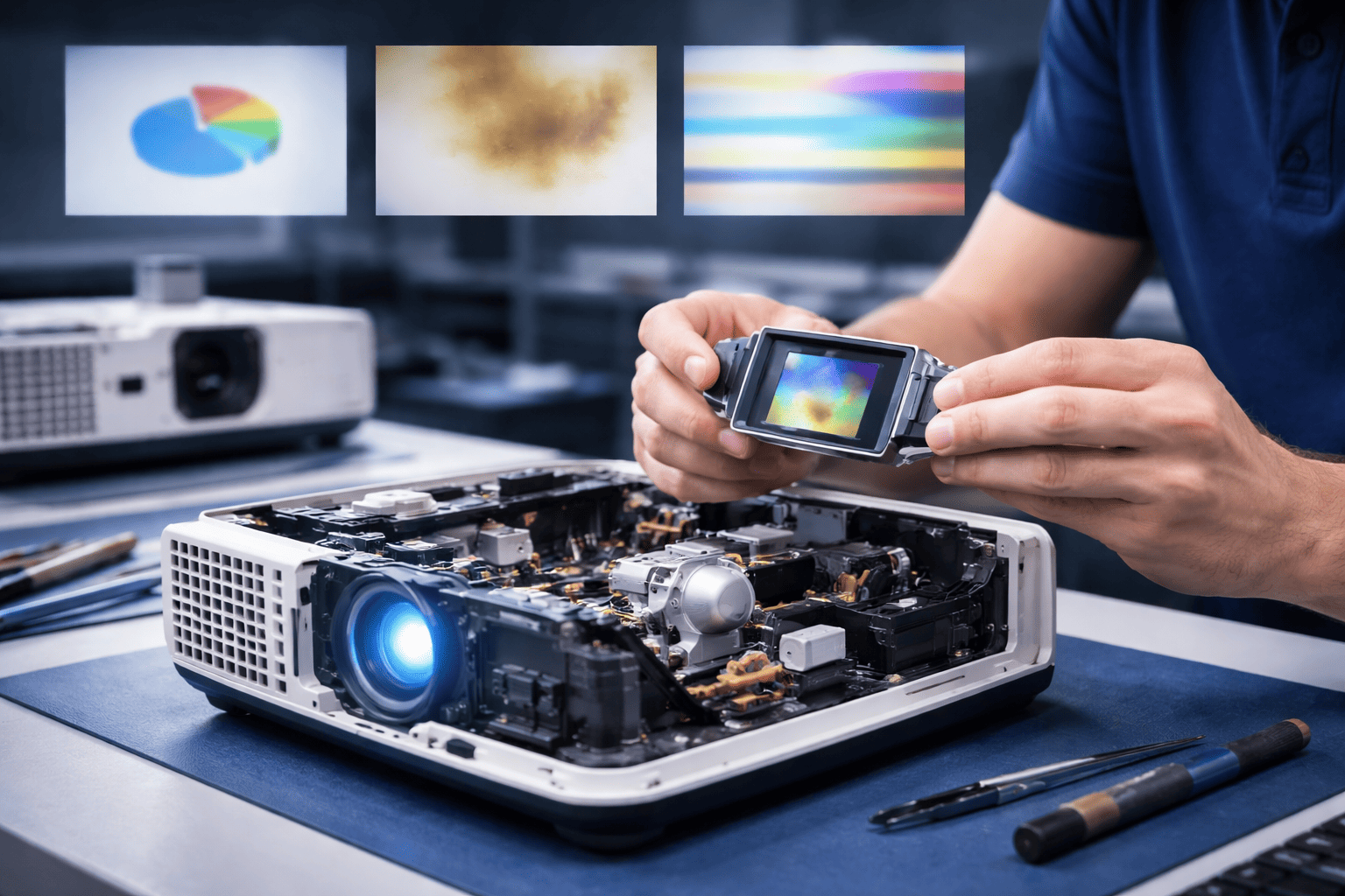 Projetores com imagem fraca, manchas ou cores distorcidas podem apresentar falhas na lâmpada, no sistema óptico ou em componentes internos. Realizamos avaliação técnica para identificar e corrigir o problema.