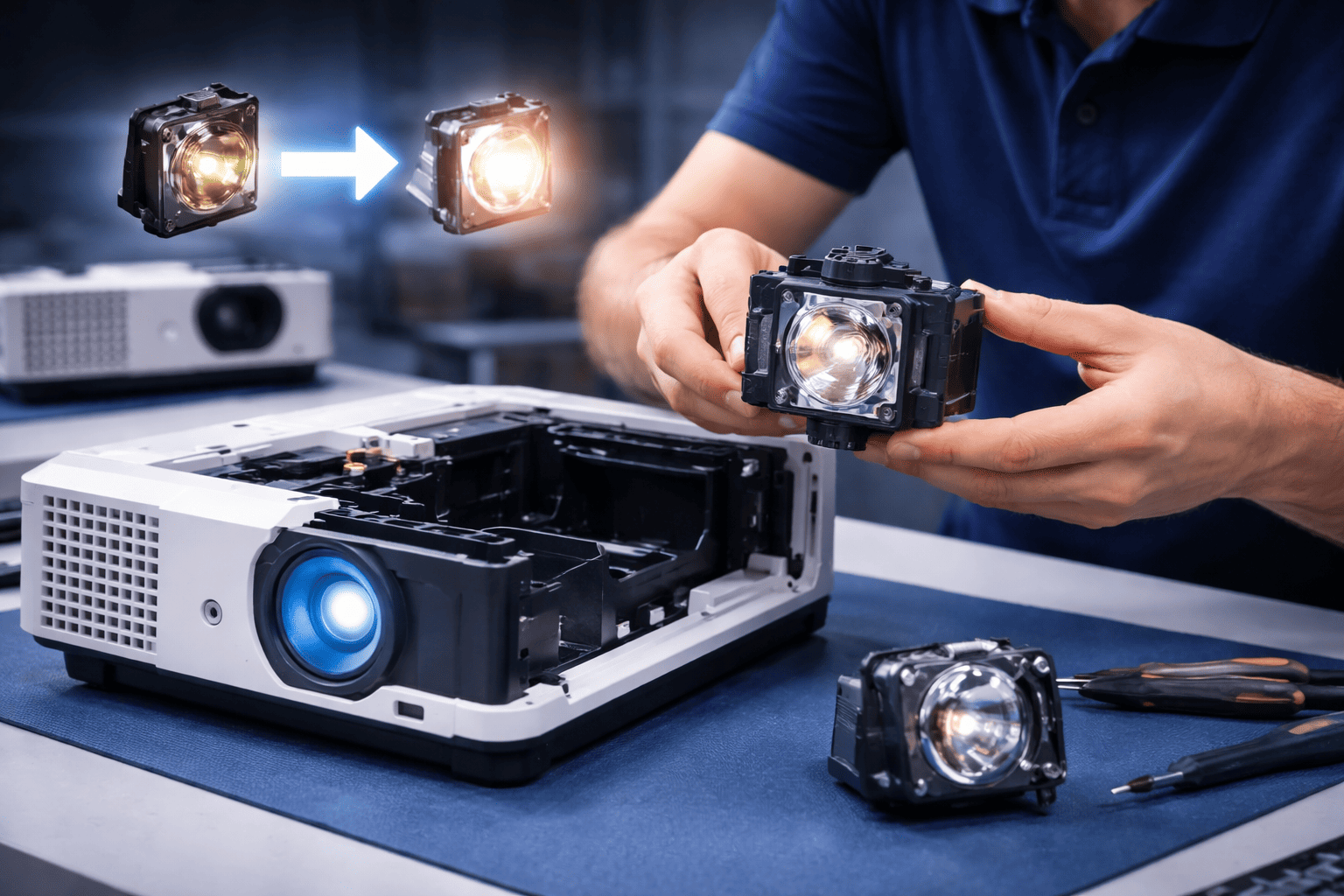 Quando a lâmpada atinge o fim da vida útil, o projetor pode apresentar baixa luminosidade ou mensagens de erro. Realizamos a substituição da lâmpada e testes completos de funcionamento.